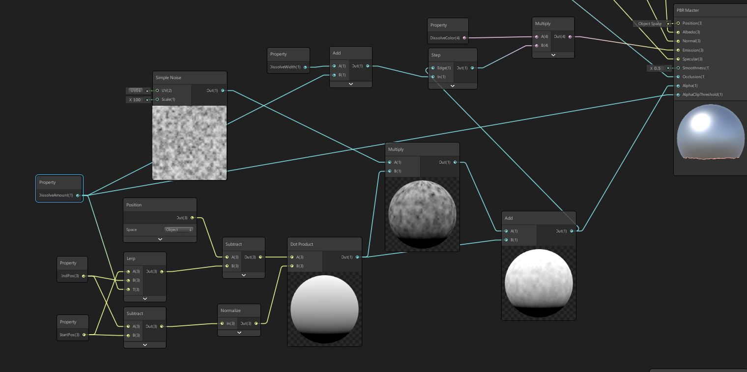 在上一篇做好了方向性的節點,再來就是透過Noise做出不規則擾動的效果,基本上打Noise就有至少三種的程序雲狀圖,這範例是使用Simple Noise,產生後將他與先前做的Dot Product做Multiply(相乘),然後結果再與 Dot Product 做Add(變亮),接著串接到Alpha,然後上篇做的DissolveAmount(Vector1),拿來控制Lerp的變化值,將他連到AlphaClipThreshold。(圖一)