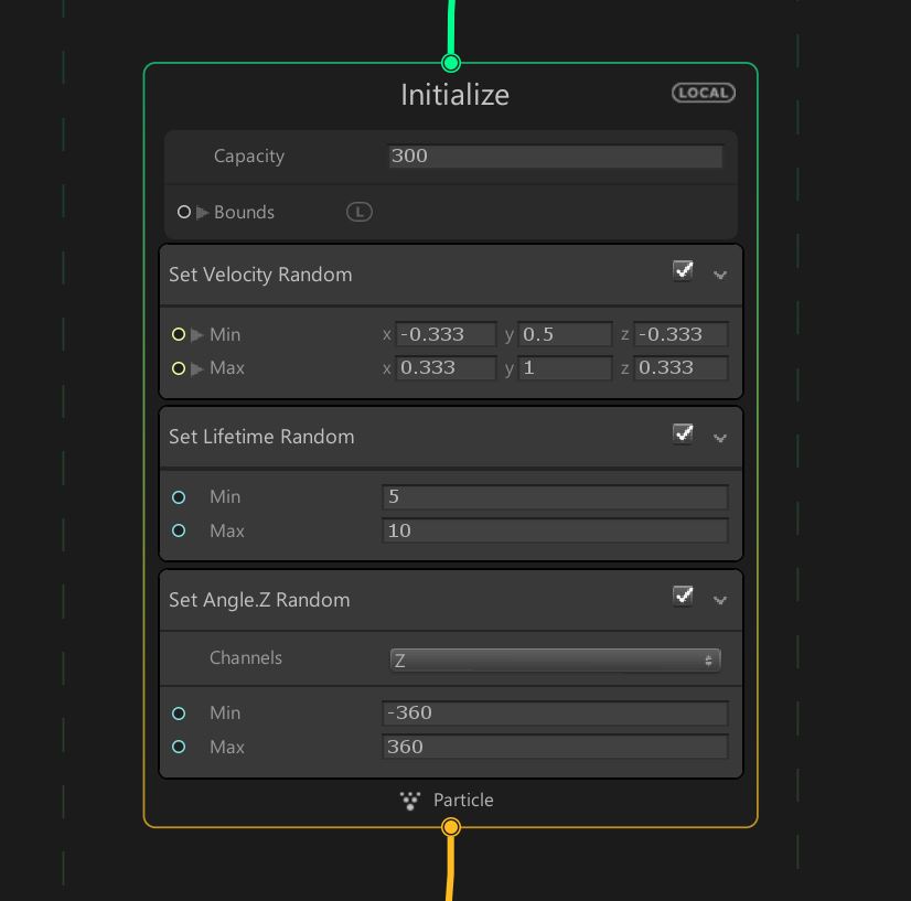 起始屬性,Capacity是總粒子量,預設還有 “Set Velocity Random(擾動亂數)" 跟 “Set Lifetime Random(粒子生命)" ,這些都可以右鍵移除或添增,這是VG源頭的例子設定,所有源頭參數都跟initalize有關連,包括 顏色 速度 生命 顏色 …等。