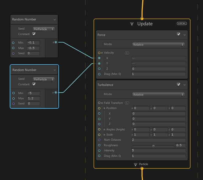 補充,如果要在一個定值中加上兩個亂數,EX: X值是1,但希望0-1之間亂數,可透過外部的參數連結,這邊將Random Number連上Force的 X Y,這樣X Y的外力就是亂數控制了。