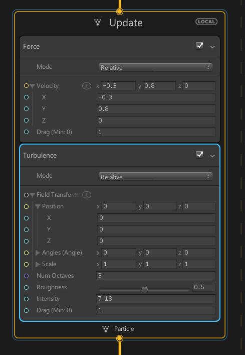 回到Udate,Update會每偵格更新粒子效果,這邊給他加上兩個外力Force Turbulance