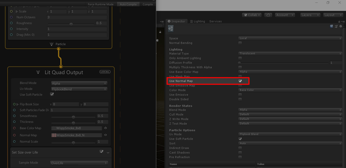 除了貼上一般的Base color Map,還需要一張Normal,我們先點選output,然後看Inspector,裡面有很多屬性內容可開關,常用包括 Use Base color map 看是要用哪種疊加模式,預設是Alpha;在這邊我們要用Noamal,所以把Use Normal map打勾,並且Material Type 從standard 改成Translucent。