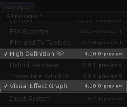 這個系統必須使用HDRP渲染,並限制在Unity 2018.3以上版本才能作用,在使用VG時跟SG(Shader graph)一樣,確認package manager,HDRP與Visual Effect 版本一致並且相同,不然很容易有奇怪的錯誤。