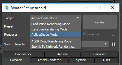 在渲染器設置上,首先先將渲染器設成Arnold,測試算圖時,將Target設定成ActiveShadeMode(以下簡稱ASM),也就是即時渲染模式,這個狀態改任何參數或調整攝影機物件,算圖視窗都會即時改變。